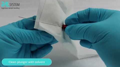 To clean the syringe, slowly aspirate half of the syringe and move the plunger up and down. Then, while keeping the needle tip submerged in solvent, remove the plunger completely and clean it with a lint free cloth using an Isopropanol (p.A. quality) or a solvent suitable to your application. The initial aspiration of solvent aids with moveability of the plunger.